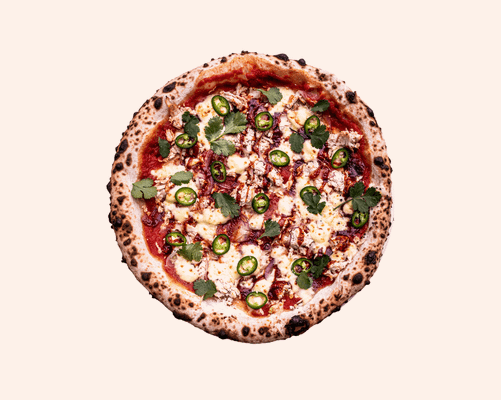 Tomato base, chicken, red onion, jalapeƱos, bbq sauce, mozzarella, sour cream, coriander