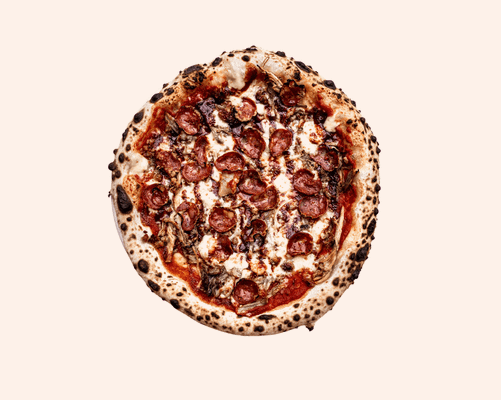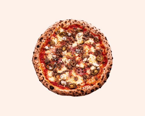 Tomato base, pork and fennel sausage, gorgonzola, red onion, capers, jalapenos, mozzarella