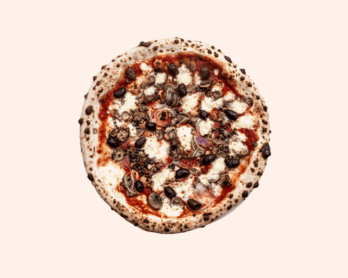 Tomato base, mushroom, red onion, capers, kalamata olives, oregano, mozzarella