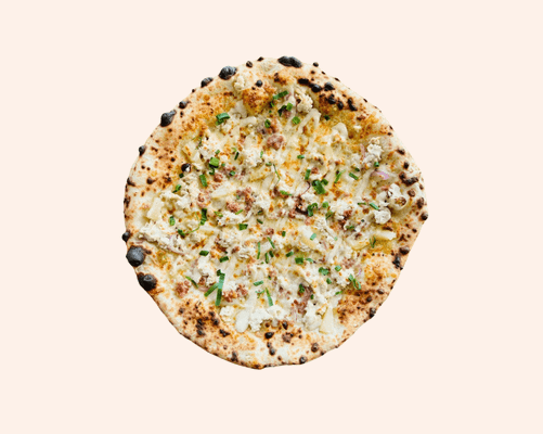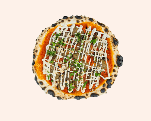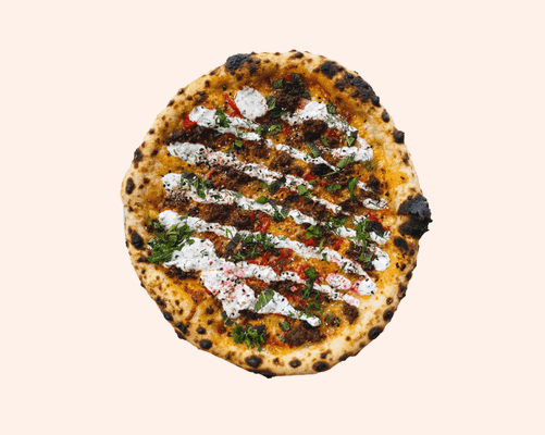 Smokey spiced capsicum base, lamb sausage, roast capsicum, mozzarella, herb yogurt, sesame zaatar, chopped herbs