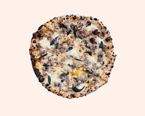 Roast garlic base, mozzarella, provolone, mushrooms, parmesan, truffle oil, fried sage