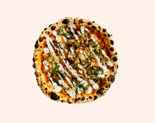 Smokey spiced capsicum base, grilled eggplant, babaganoush, vegan cashew cheese, chopped hersb, dukkah (almond, sesame, pistachio)