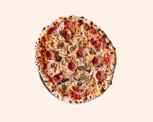Tomato base, mushrooms, pepperoni, red onion, jalapenos, LP cheese blend, pepper