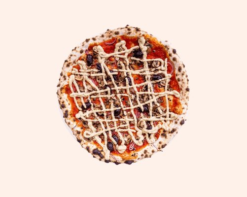 Tomato base, mushrooms, red onion, capers, kalamata olives, oregano, cashew cheese